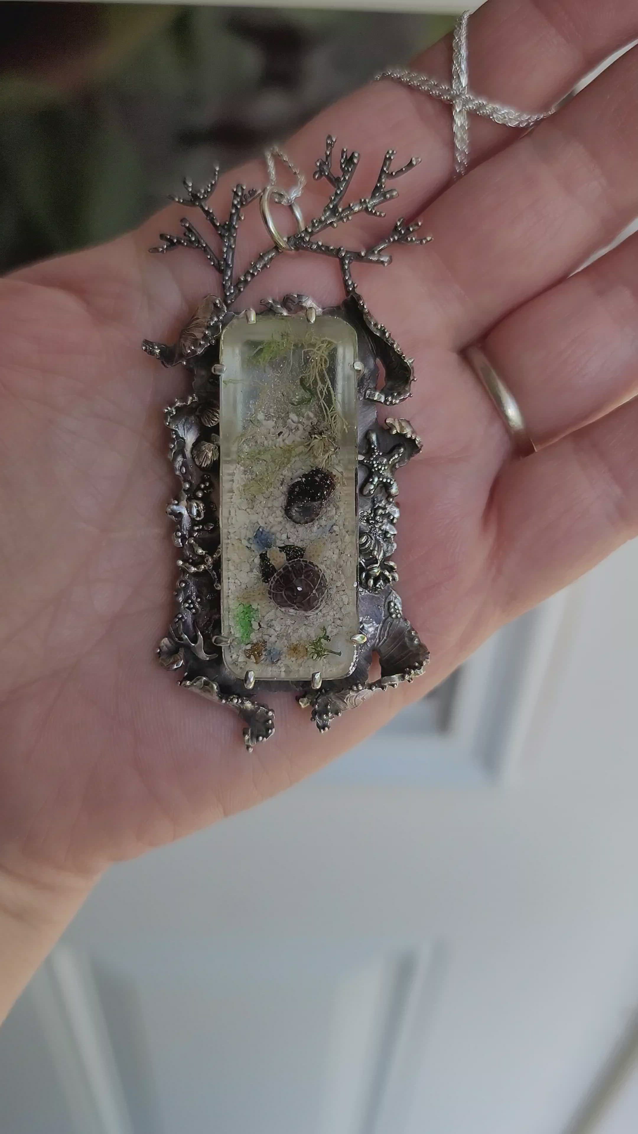 Can you see her struggling under the ocean waves trying to get to where her little soul is begging her to be? Hanging onto that rock with her front flippers, she looks out to where her forever home will be. Surrounded by seashells, seaweed, and the prettiest chunks of sea glass, she ventures on after her rest from fighting those humongous ocean waves. The pieces of Mother Nature's art surrounding her in this resin cabochon were all found treasures on the beach of Cape Cod. The sand below her fades into the ocean water. Real flakes of sterling silver were sprinkled into the resin as it was curing to bring even more sparkle to her home. The resin cabochon is prong held in the center of an ocean beach ecosystem. Lapping waves curl around the cab and within them are hidden treasures as well. Different types of sea grasses, seaweed, starfish, seashells, rocks, bubbles, and even the tiniest hand formed hermit crab with teensy claws. *click clack*