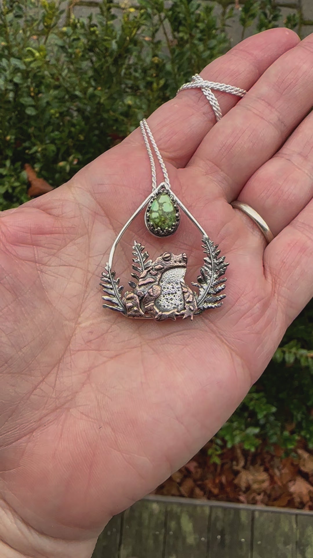Our little toad friend is made from sterling silver and copper for his patchy chubby body. The ferns surrounding him are sterling silver. The one of a kind pendant is about 1.75 inches tall and about 1.5 inches wide. A green spotted Sonoran gold turquoise sits above them all. He will come to you on an 18 inch long sterling silver rope chain.