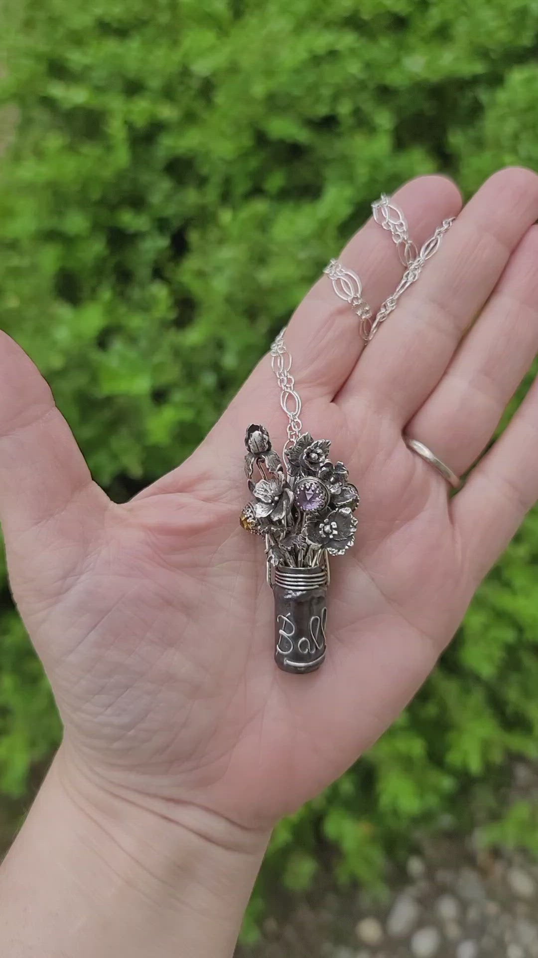 How would you like to create your own vase with the flowers you love? Each of these flowers will be handmade from melted wire and sheets of recycled silver and carved by hand from scratch. Intention will be poured into each flower while I craft them for you. You will get to choose 5 flowers that are special to you, two leaf sprigs, and 3 gemstone stems. The photos below will show an example of the types of silver bouquets we could create together. Very intricate and difficult to make flowers may cost a bit more but we will discuss that together. You can choose for your bouquet to be made in a Ball jar or in a 4-sided decorative vase. The vase will come with floral foam that you can stick your flower stems into to keep them in position. After using the piece of floral foam a few times, you just scoop it out, and add another piece in to play again!