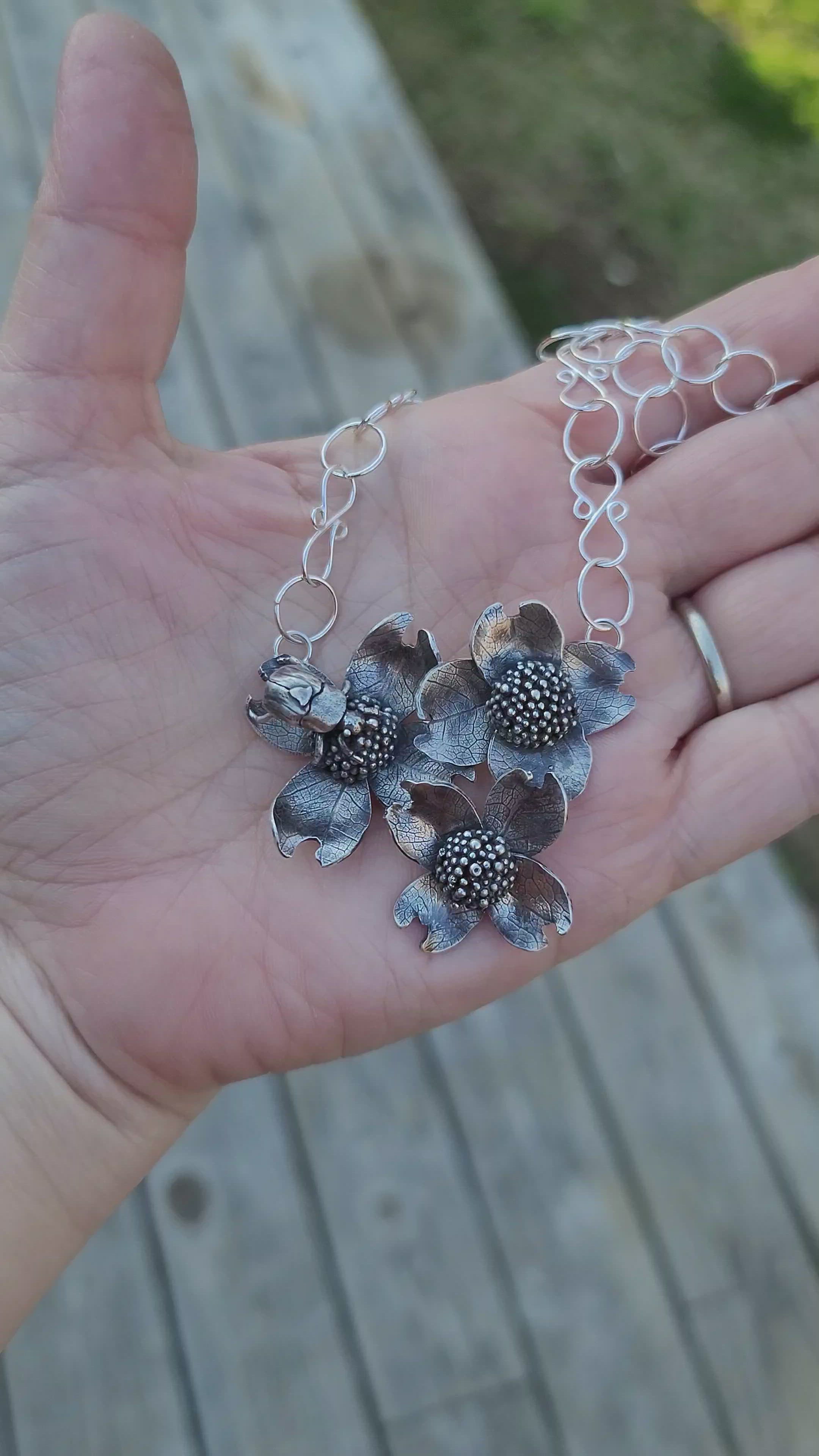 The little one of a kind and hand carved beetle is trying to hide among the dogwood cluster. I carved him entirely from the silver itself and gave him sweet details to mimic their real cousins. He blends right into his surroundings. How fun will it be when someone admires your necklace and then spies your little beetle friend?