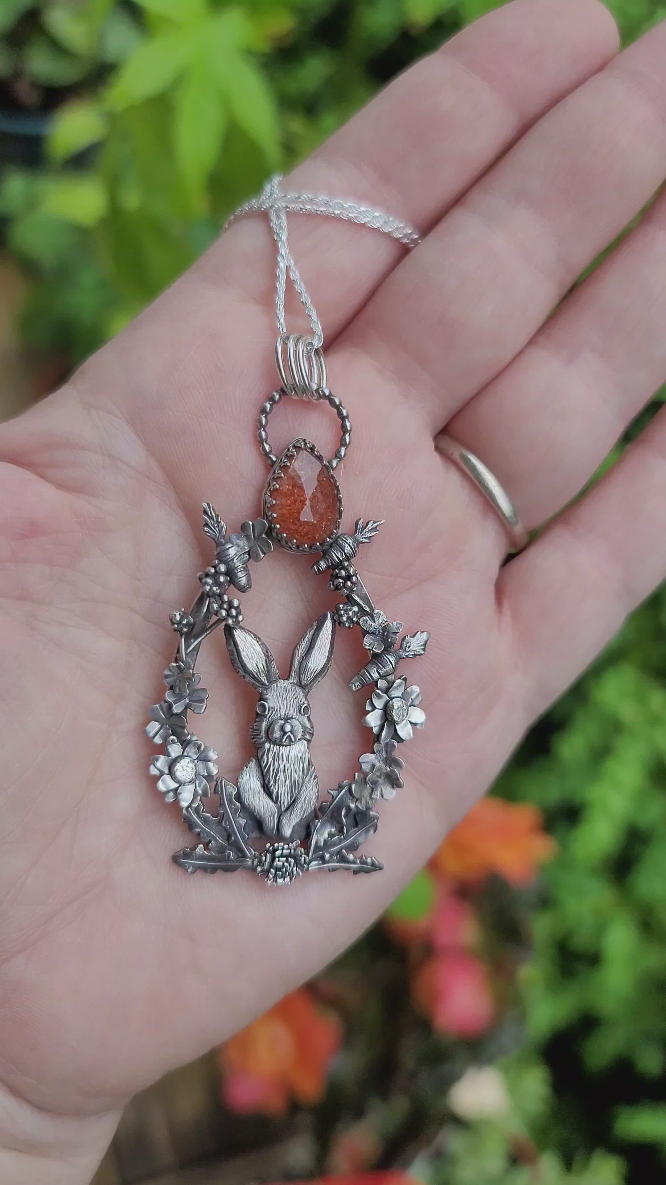 The pendant itself measures about 2.5 by 1.25 inches wide. Each element of this piece was carved by hand from the silver itself. All of a rabbits favorite things! Dandelion, fresh carrots, tiny raspberries, chamomile flowers, and clovers. Can you spot the hidden 4-leaf clover?