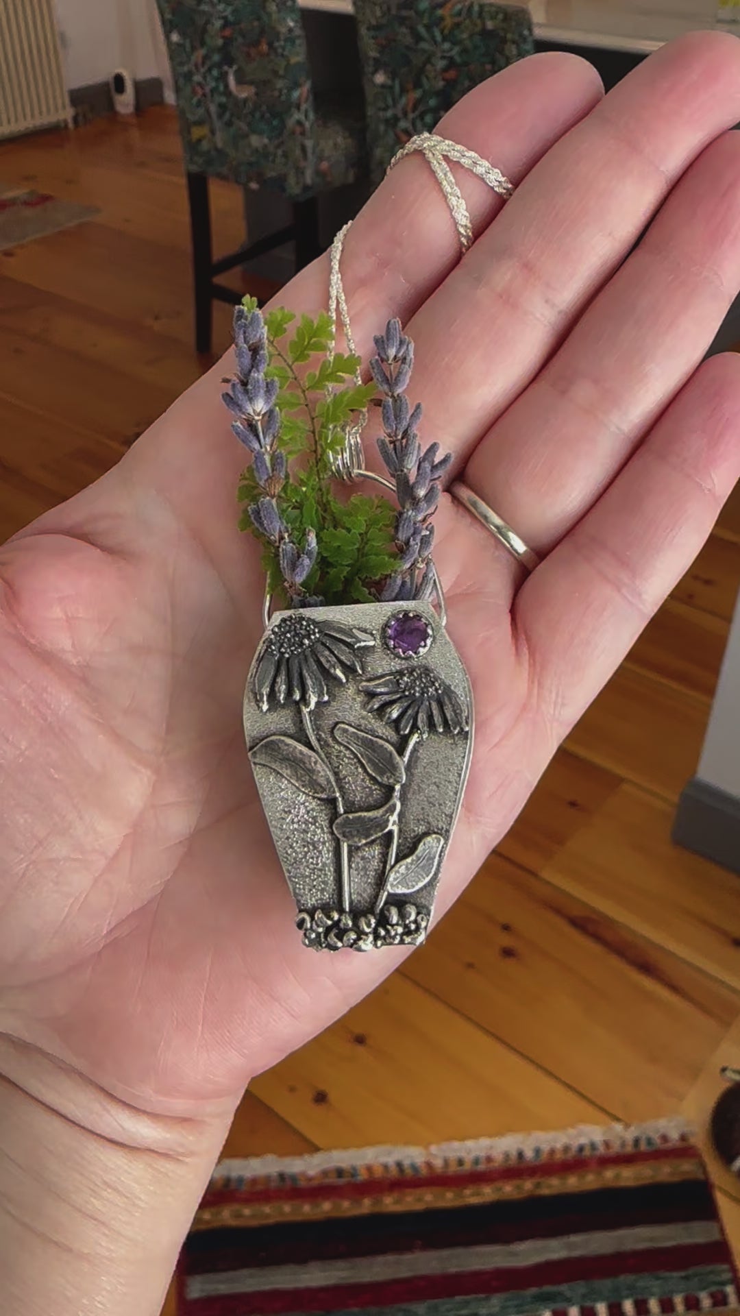 The vase including the handle and three loops that hold it onto a necklace measures about 2.75 inches tall. Just the vase itself measures about 1.75 inches tall. It is about 1.25 inches across at the widest point. It will come on a removable sterling silver necklace that is 18 inches long. A little rose cut purple amethyst sits at the top of the vase. Amethyst is February's birthstone. The back of the vase has been given a leaf pattern using a real lead and at the top is my maker's mark of Max the cat.