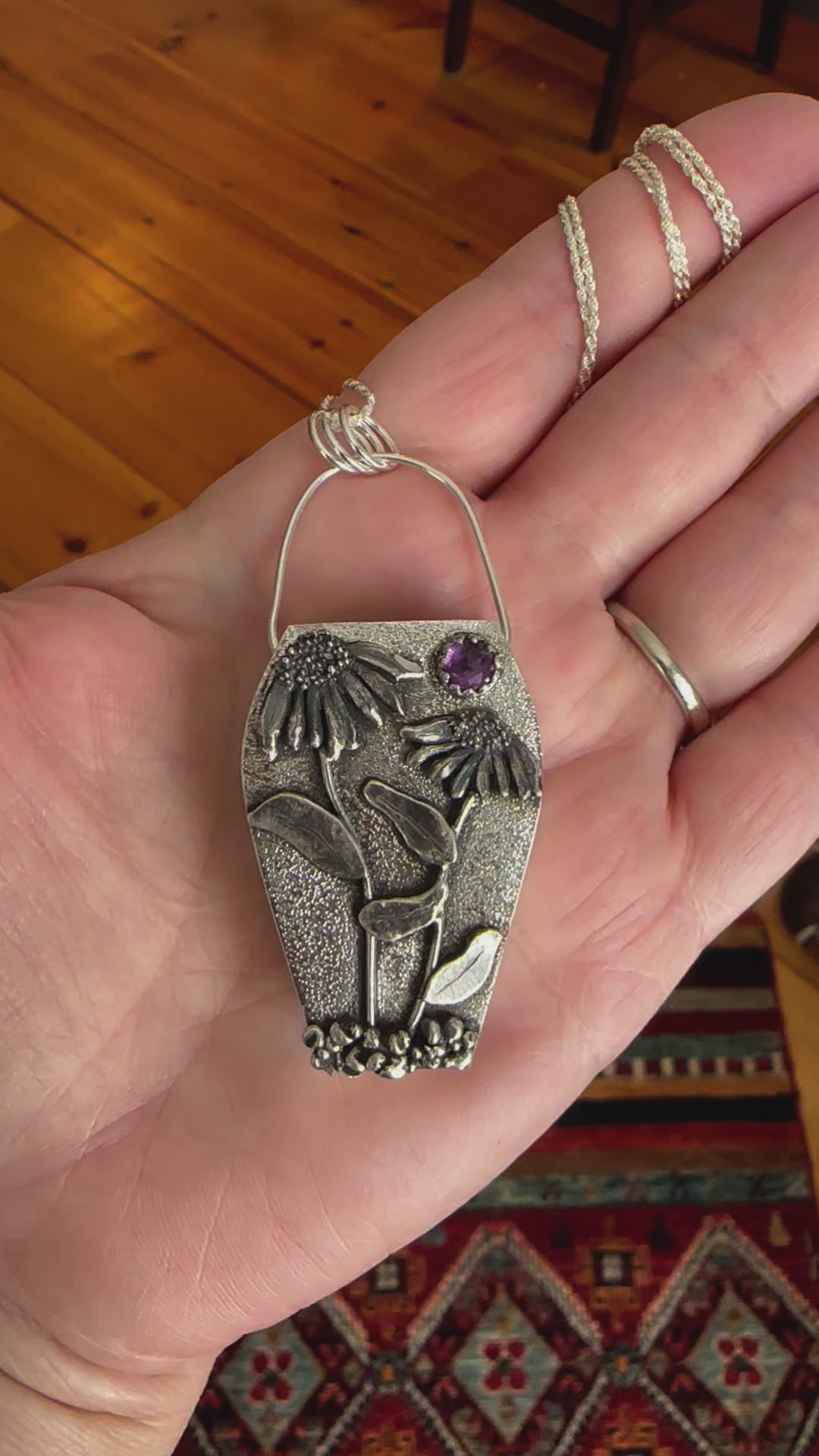 Echinacea comes from the Greek word echinos, which means hedgehog. This refers to the flower's spiky, cone-shaped center. I think that is the best way to name a plant. By what adorable animal it resembles. I created this coneflower vase necklace because they are one of the most beloved flowers in my native garden. It seems to attract everyone! These plants that are in the daisy family are also medicinal. They are used for many different things but my favorite is helping to strengthen my immune system and healing me when I have a cold or the flu. So, pretty, beneficial to our native pollinators, and good for us!
