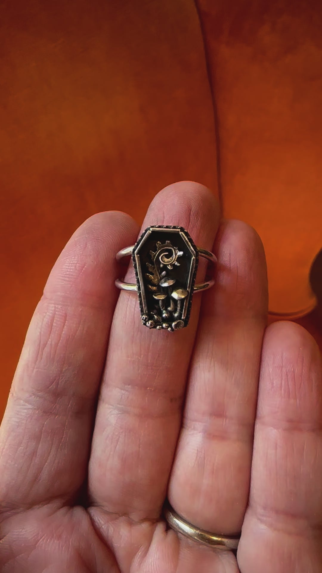 A tiny chunk of forest set into a coffin. This little nature ring has just a few simple elements, but together, make an ecosystem. A trio of mushrooms are planted in the soil next to an unfurling fiddlehead fern. This ring was made entirely from sterling silver, each element hand shaped from silver, and one of a kind. The double band fits a size 7.5.