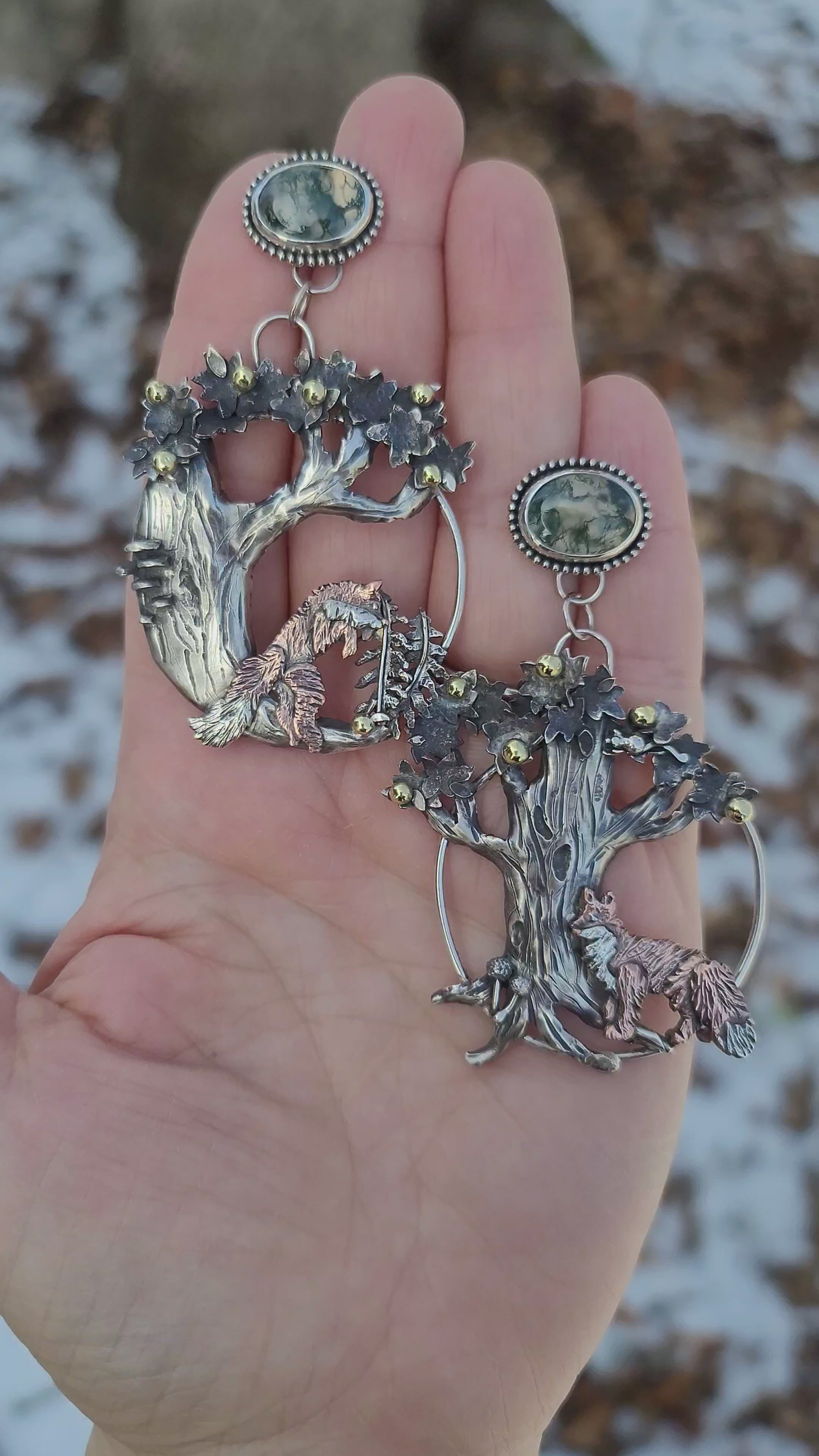 Can you see the tiniest mouse hiding up in the tree leaves? She is the smallest mouse I have ever carved by hand and she was made especially for these earrings. These mismatched earrings were made entirely by hand from scratch so there will be no other pair like them in the world. Each earring is about 3 inches in total length from the top of the moss agate stones to the bottom of the tree roots. The hoops themselves are about 2 inches tall and 1.75 inches wide. Even though they are very intricate and look large they aren't that heavy. They are only about 1/2 ounce each. Made entirely of recycled sterling silver with bits of copper for the foxes and brass apples, the earrings are made with sterling silver ear posts and earring backs. Hand chosen moss agate stones were added to these forest earrings because of their feel of belonging to the theme. Each tiny apple carved by hand, mushrooms made from molten silver and shaped while still melted, and the fluffiest two foxes that you are sure to fall in love with. These earrings tell a story of your favorite animal.