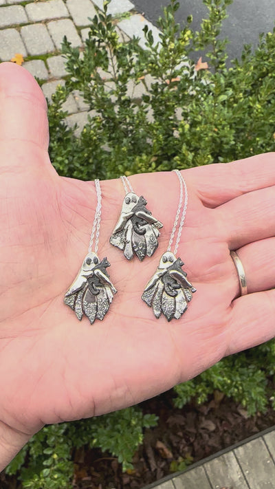 Every one of these sterling silver necklaces are made from scratch. Each is a tiny bit different from the others but they are all the same size, about 1 inch tall and .75 inches wide. They will come on an 18 inch long sterling silver necklace so you can wear them as soon as they arrive.