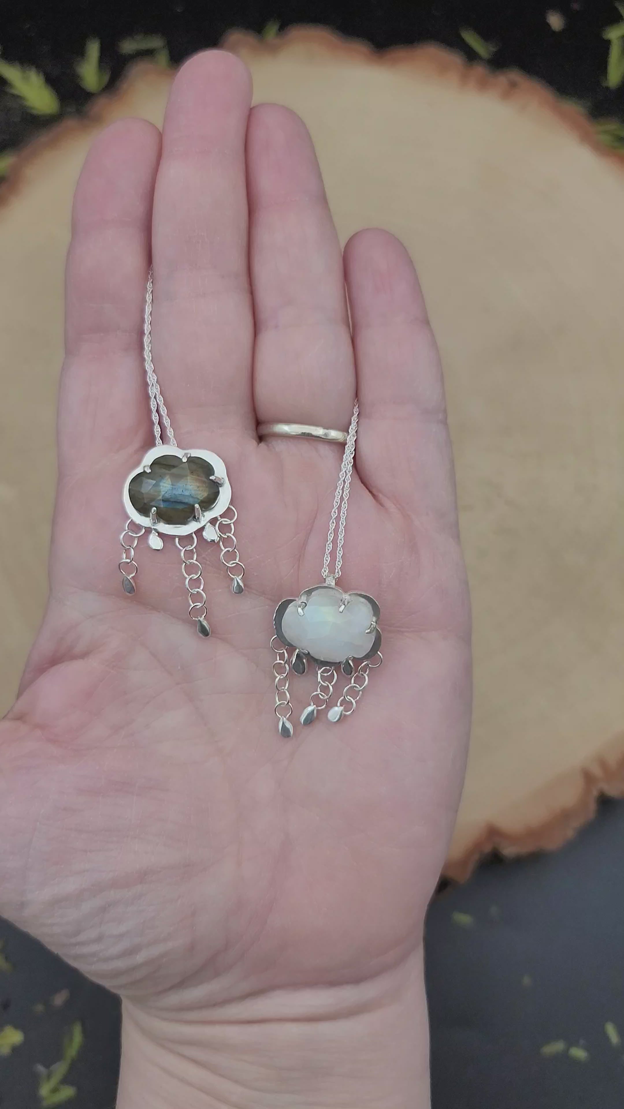 Each one of these little rainclouds will be made for their person. You can choose either a (sad) labradorite stone or a (happy) moonstone for your necklace. Each stone is a tiny bit different because of their hand cut nature. They are all about .75 inches long. Each stone will be backed with sterling silver, prong set, and then given tiny hand carved sterling raindrops below it. All the same style but each with a different stone. The finished pendant will come on an 18 inch long sterling silver necklace chain making it ready to wear when it reaches you.