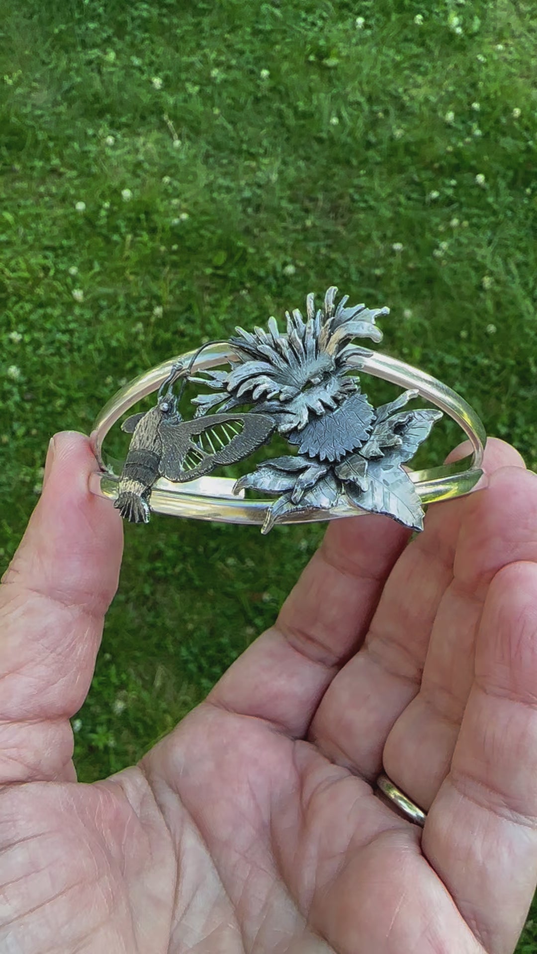 An opened back bracelet makes this piece adjustable for many sizes of wrists. It is made entirely of sterling silver and one of a kind. The hummingbird moth is drinking from a monarda flower, or bee balm, with its thin black tongue. Their see through wings are very unique and appear as little windows!