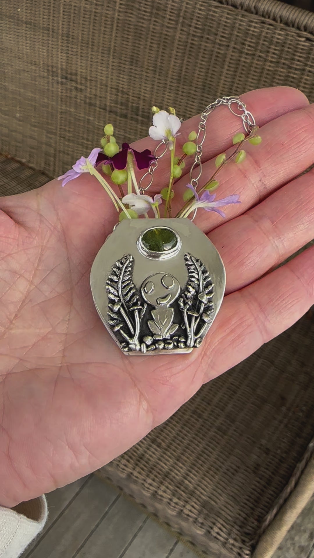 The vase itself is about 1.5 inches tall and about 1.5 inches wide. The nonremovable sterling necklace is about 20.5 inches long. Because of the looped design of the chain, you could clasp your lobster claw in a different spot to make the necklace a little shorter if you wish. He was given a grass green tsavorite gemstone (a type of garnet) at the top to represent the lush forest. The photos make the gemstone appear darker than it is because yours truly is not a very good photographer.