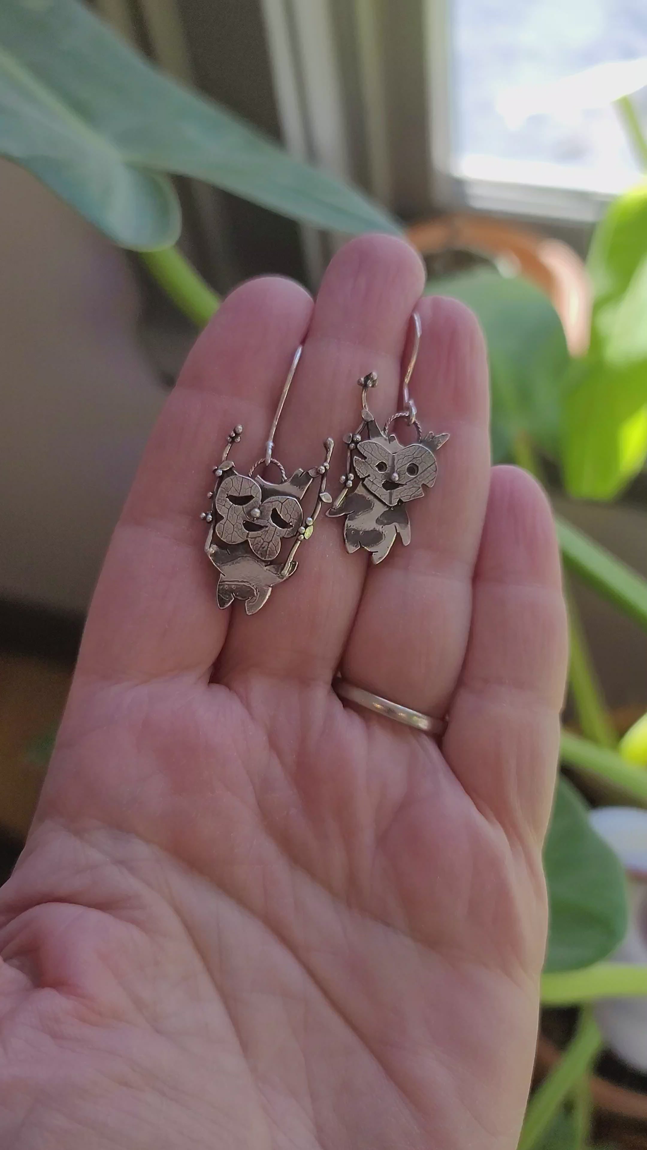 Each korok was made from melted down recycled sterling silver and then cut out and etched to give them their personalities. They are both shaking their tiny berry twigs in excitement. Their faces were made by pressing a *real* leaf into the silver and rolled through my press to give them a one of a kind design. Each leaf is destroyed in the process so no two korok faces will ever be the same. Both of them are about 1 inch tall and made to dance around on a sterling silver ear wire.