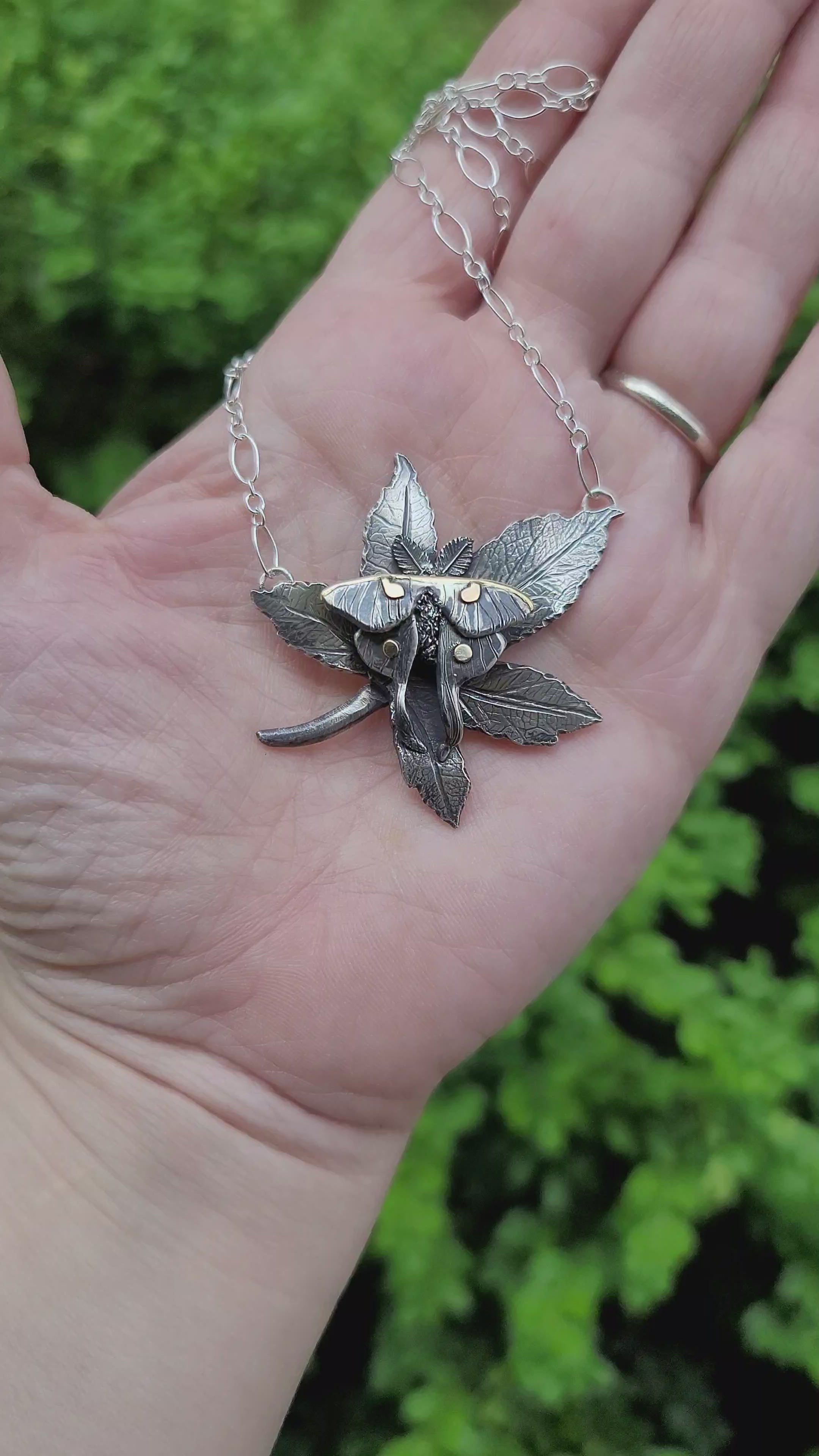 The sterling silver necklace created for this pendant measures at 19 inches long. You are able to make the necklace shorter, if you choose to, by using the lobster clasp in another loop within the chain. The luna moth's leaf is about 2 inches across. She was given solid 14k gold across the top of her wings and her 4 wing spots that are used to protect herself from predators is solid gold as well. This necklace and moth are entirely hand forged to be one of a kind.