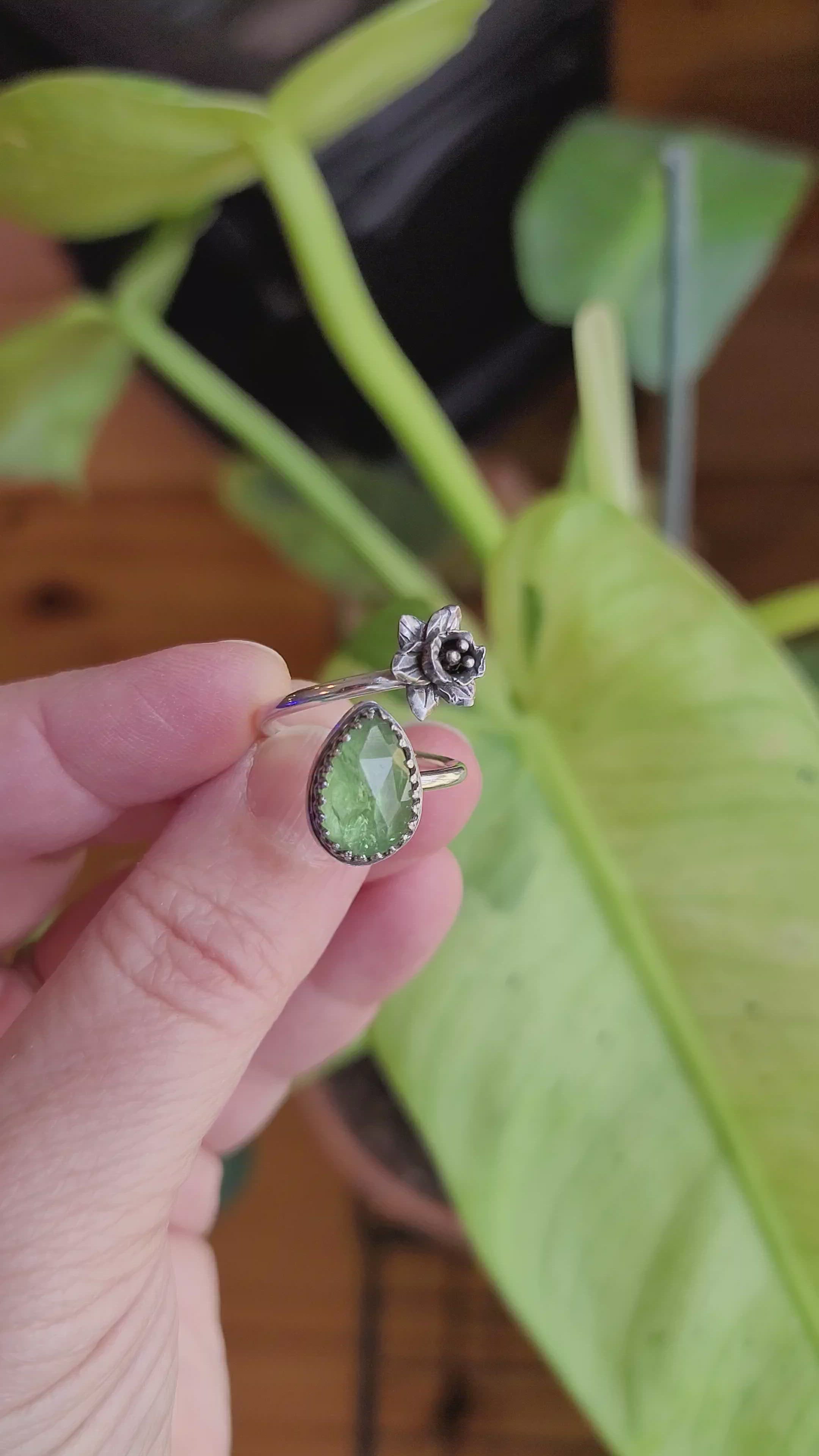 With this purchased listing, and choice of one stone and one ring band style, I will create for you your own little piece of nature. Since these rings are made from scratch for each of their people, no two rings will be exactly alike. All will be made with a hand carved daffodil and a decorative sterling silver bezel snuggly holding onto the gemstone you chose as your favorite. The photos and videos below show several different rings so you shall see the slight differences between then all making them unique.