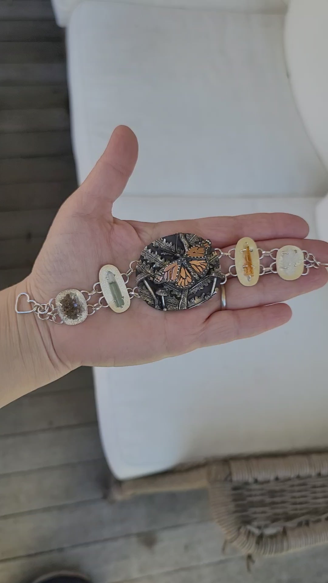 There are four gemstones next to her that will never again be repeated in nature. The two stones at the ends of the bracelets are Herkimer diamond clusters. One light, one dark, to represent her black and white spots. Both are covered in tiny bright crystals. There is a green phantom quartz point to her left to represent the green Earth. A beautiful mineral that has a soft green smaller crystal that has long been growing within the quartz. To the right of the monarch is an orange spessartine garnet point to represent her bright orange coloration. This stone is such a wonderful color with unique tiny crystals growing all over it.