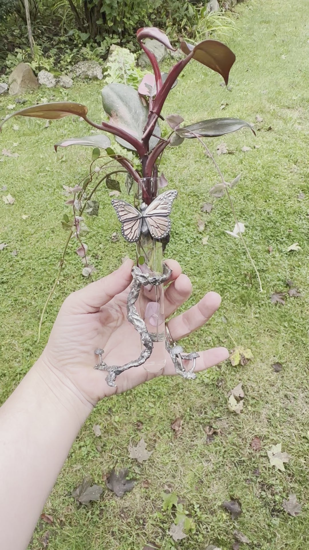 This is a female that I made to tend to your plant cuttings and flower arrangements. She sits atop with outstretched wings on a thick sterling silver tree branch that is wrapped around a glass vial. She is made from sterling silver with bright copper spots. Can you see her tiny curled tongue? At the bottom of the meandering tree branch are a few tiny mushrooms popping through reaching upwards. The propagation holder measures 6 inches from the top of the glass to the bottom feet. A one of a kind piece that could never be replicated again.