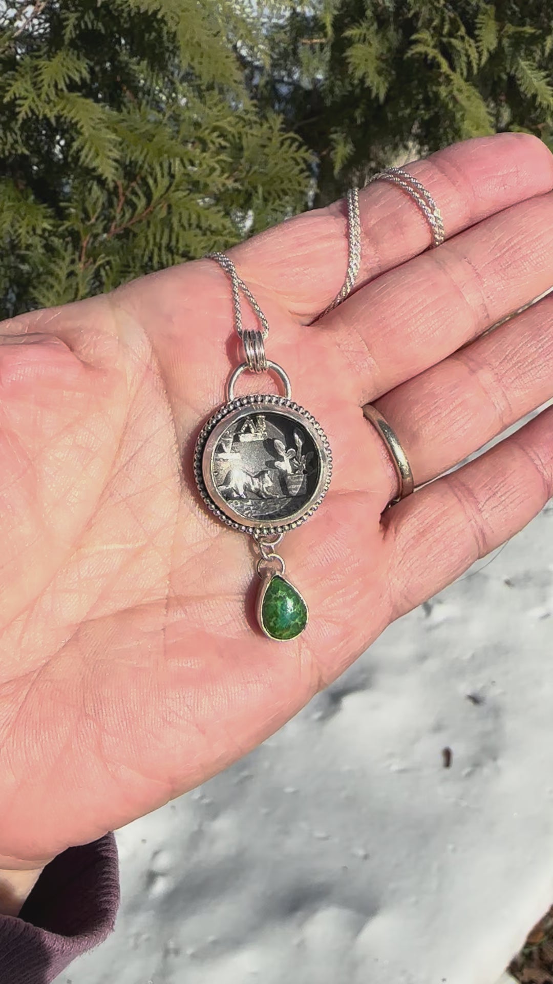 This one of a kind necklace features the tiniest cat taking a nice long stretch in front of a potted houseplant. Above them, two little shelves holding your favorite books and vases because nothing is safe at cat level. This pendant measures a little more than 2 inches long from loops to bottom of the houseplant green Sonoran Gold turquoise drop. The domed glass cabochon keeping the tiny scene tucked away safely. The pendant will come to you on an 18 inch long sterling silver rope chain shown in the photos. My Maker's Mark of Max the cat sits on the back.