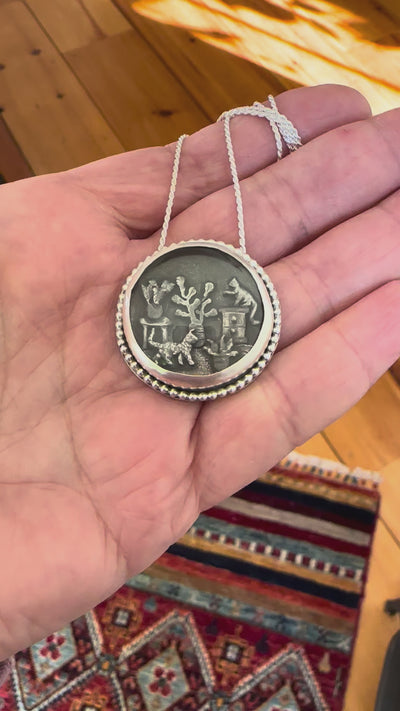 This one of a kind piece measures about 1.25 across. Every single detail was hand drawn and cut out of sterling silver to make a tiny scene. Then a glass dome was set above the scene to keep everyone tucked in safe. These two kitties are just asking for trouble! One already up on the cabinet pawing at the fiddleleaf fig, the other coming to the crime scene with trouble in their paw steps. There are three plants in this piece and even includes the tiniest little alocasia you will ever see!