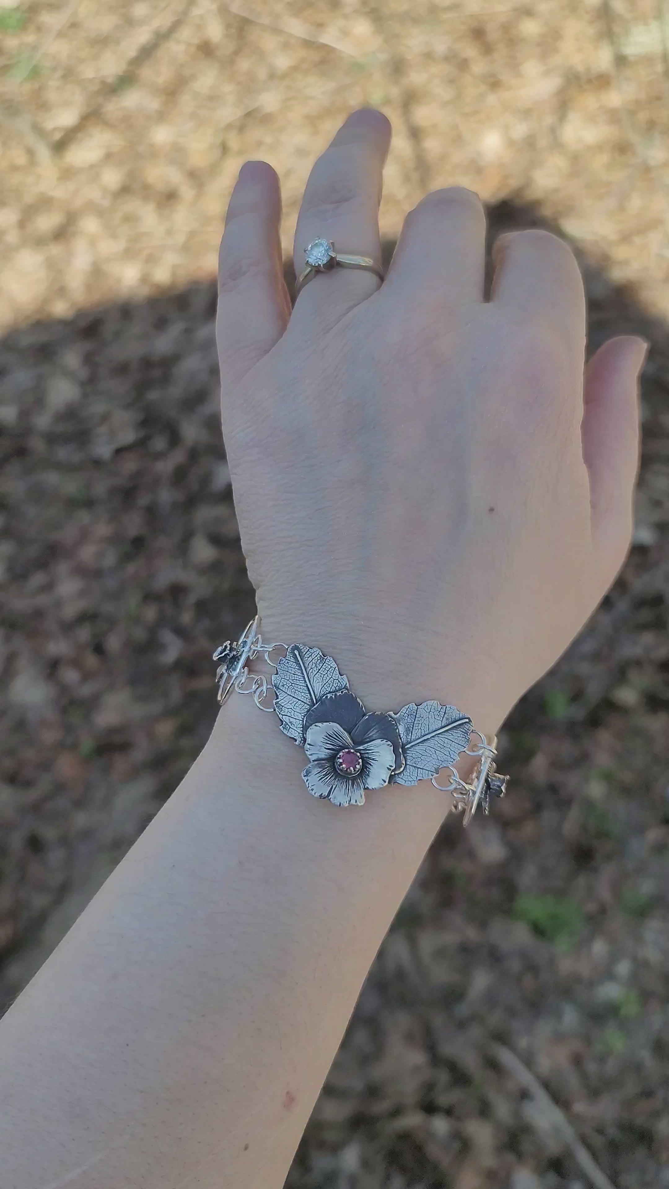 Each element of this recycled sterling silver bracelet was made by hand to create a one of a kind piece of heirloom jewelry. Pansy and daffodil flowers are some of the first springtime flowers we see and remind us that winter is now over. They often are very special to people because of who they remind them of. Both pansies and daffodils symbolize love!