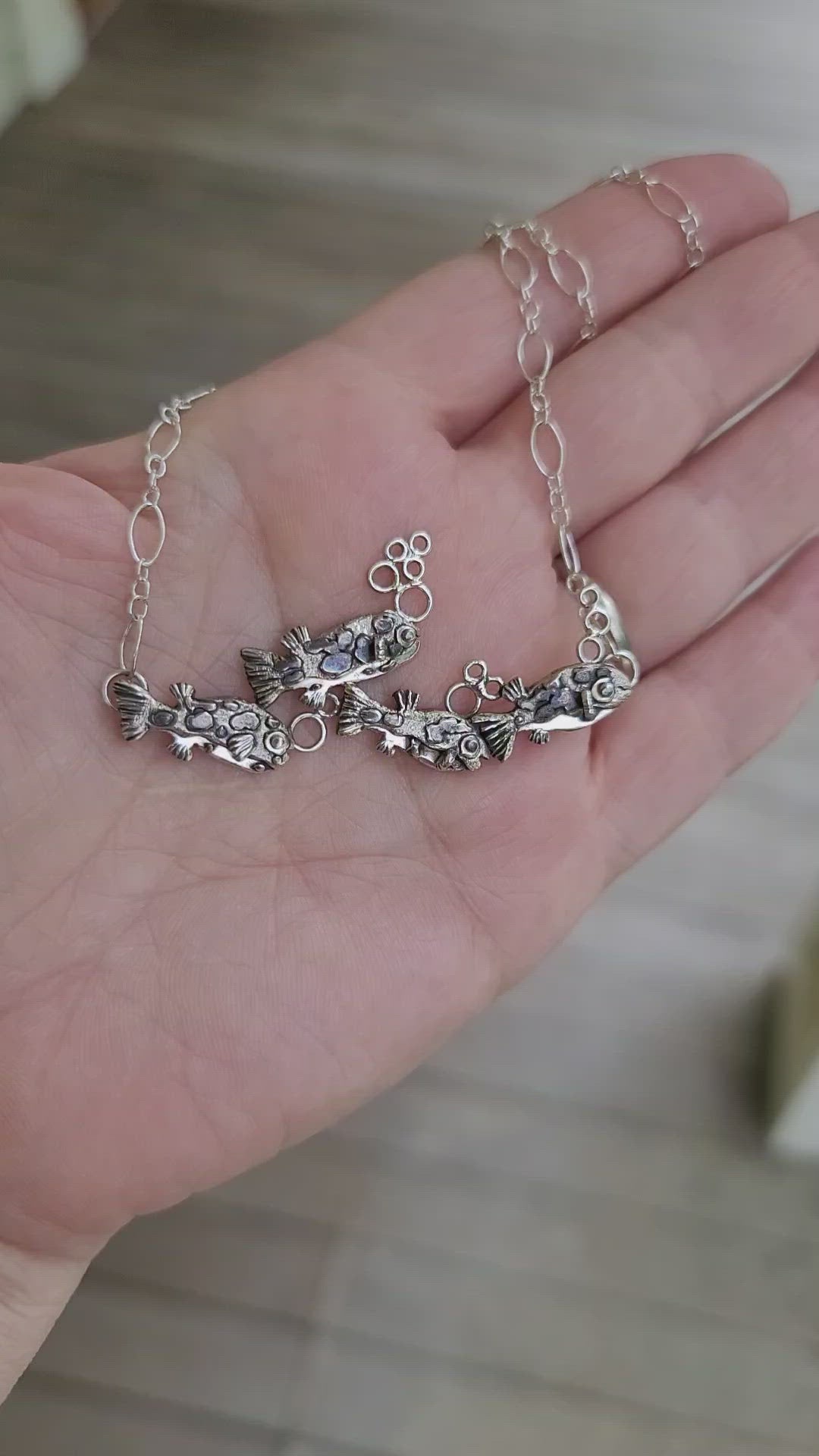 This one of a kind necklace was made from sterling silver by hand. The four little fish swim in a row and are about 2.25 inches across and are on an 18.5 inch long necklace. Tiny bubbles above them make them even cuter! The lobster clasp to close the necklace holds onto a heart shaped ring as a sweet surprise for you.