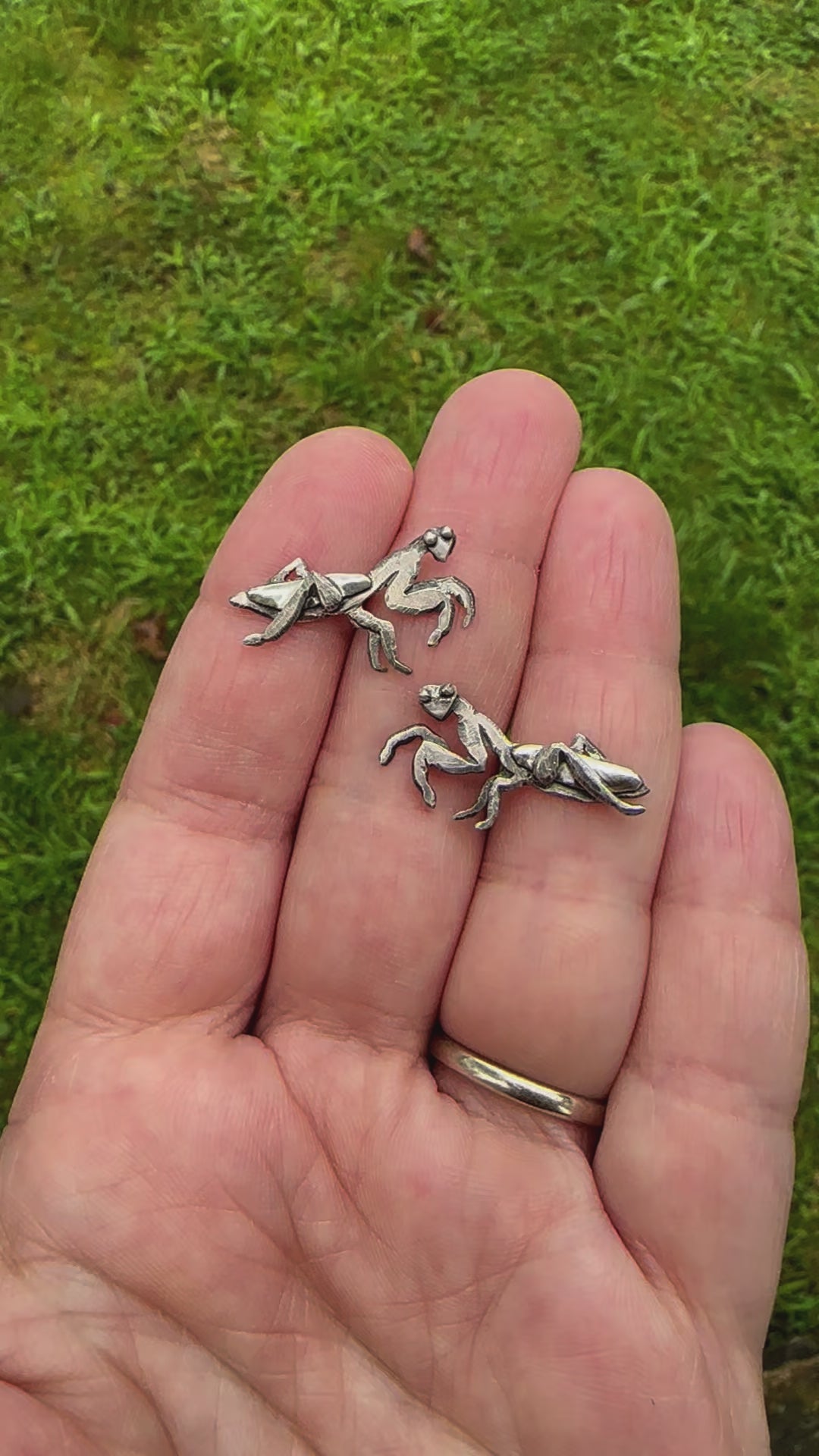 How sweet are these little Carolina mantis stud earrings?? They are hand carved and made entirely from sterling silver. Each tiny insect friend is about 1 inch long and one of a kind. They just want to hang out with you in your ears and watch for flies to hang around to snack on.