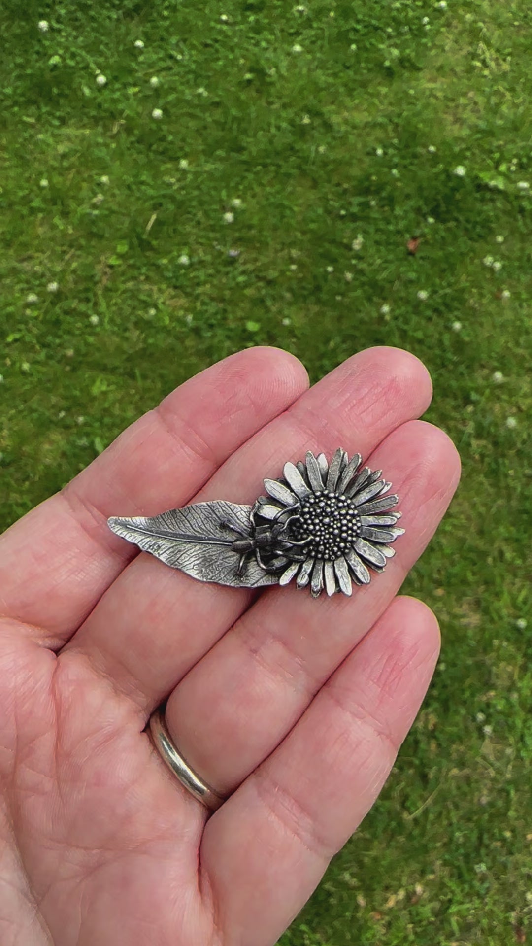 This one of a kind ant and aster flower pin was made from sterling silver, including the pin and back. It is about 2 inches long and 1 inch tall.