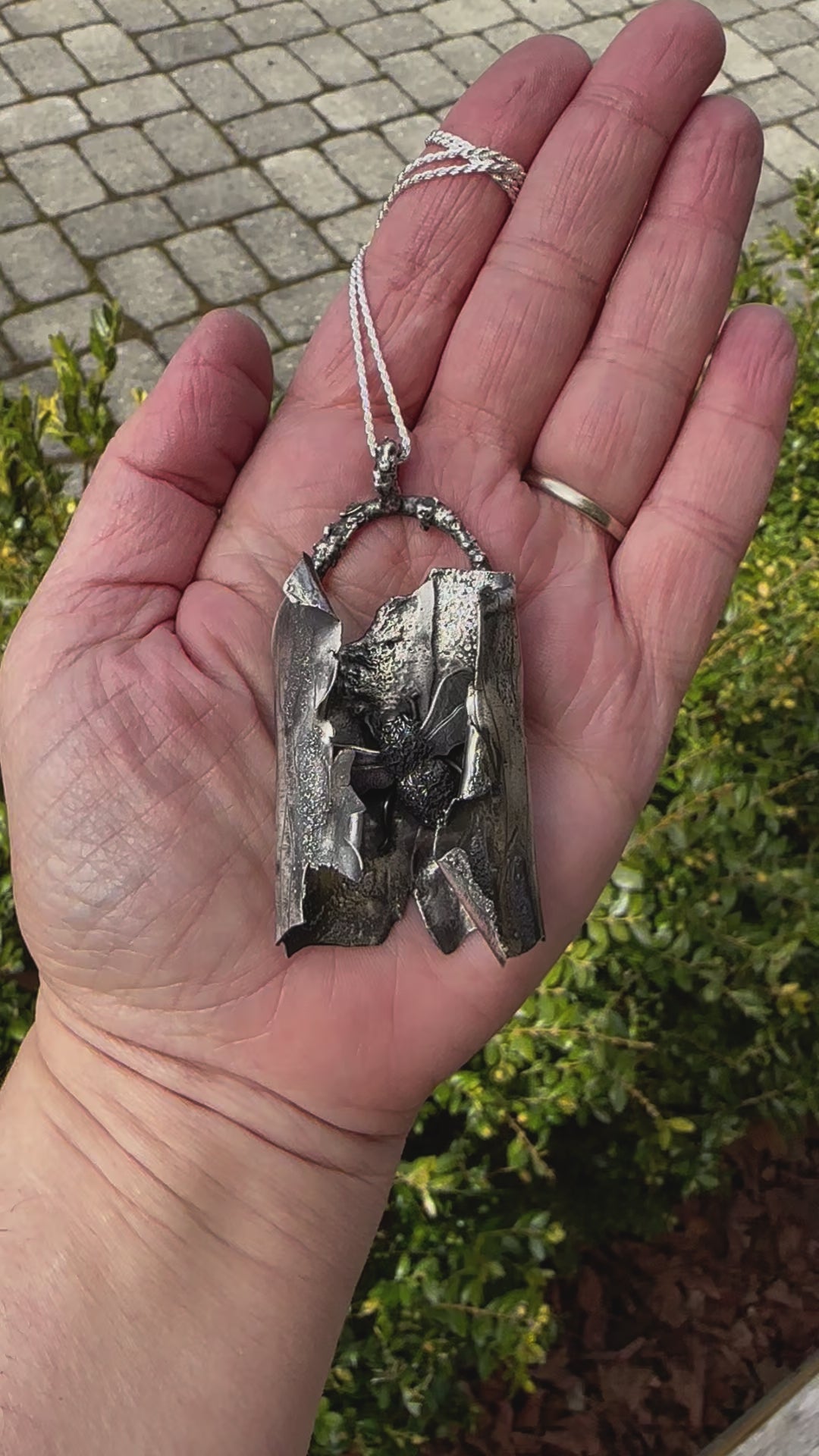 This queen found a dead piece of tree bark to sleep in for the winter. The perfect piece that curls up around her and keeps her safe. The pendant itself measures about 3 inches tall and about 1.5 inches wide. This one of a kind pendant was made entirely from sterling silver from scratch. Her fuzzy body and etched wings, tiny bent legs and pretty black eyes, the textured tree bark curled around her, and the stick above her that hangs this piece on a necklace.