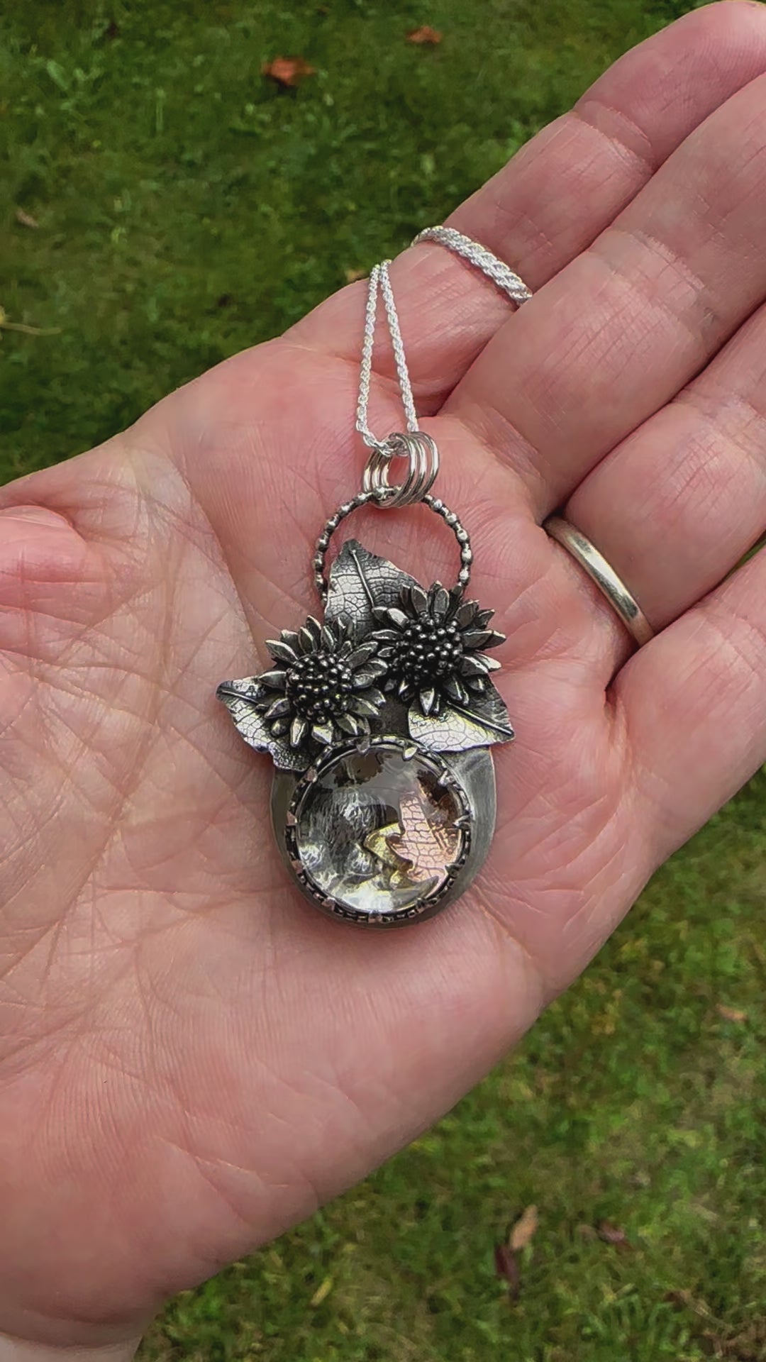 This one of a kind pendant is about 2.25 inches tall and 1.5 inches wide. Above the tiny world that the fuzzy mouse lives in are two sunflowers tucked amongst some leaves. This necklace was made for all the fall feels but can be loved all year long.