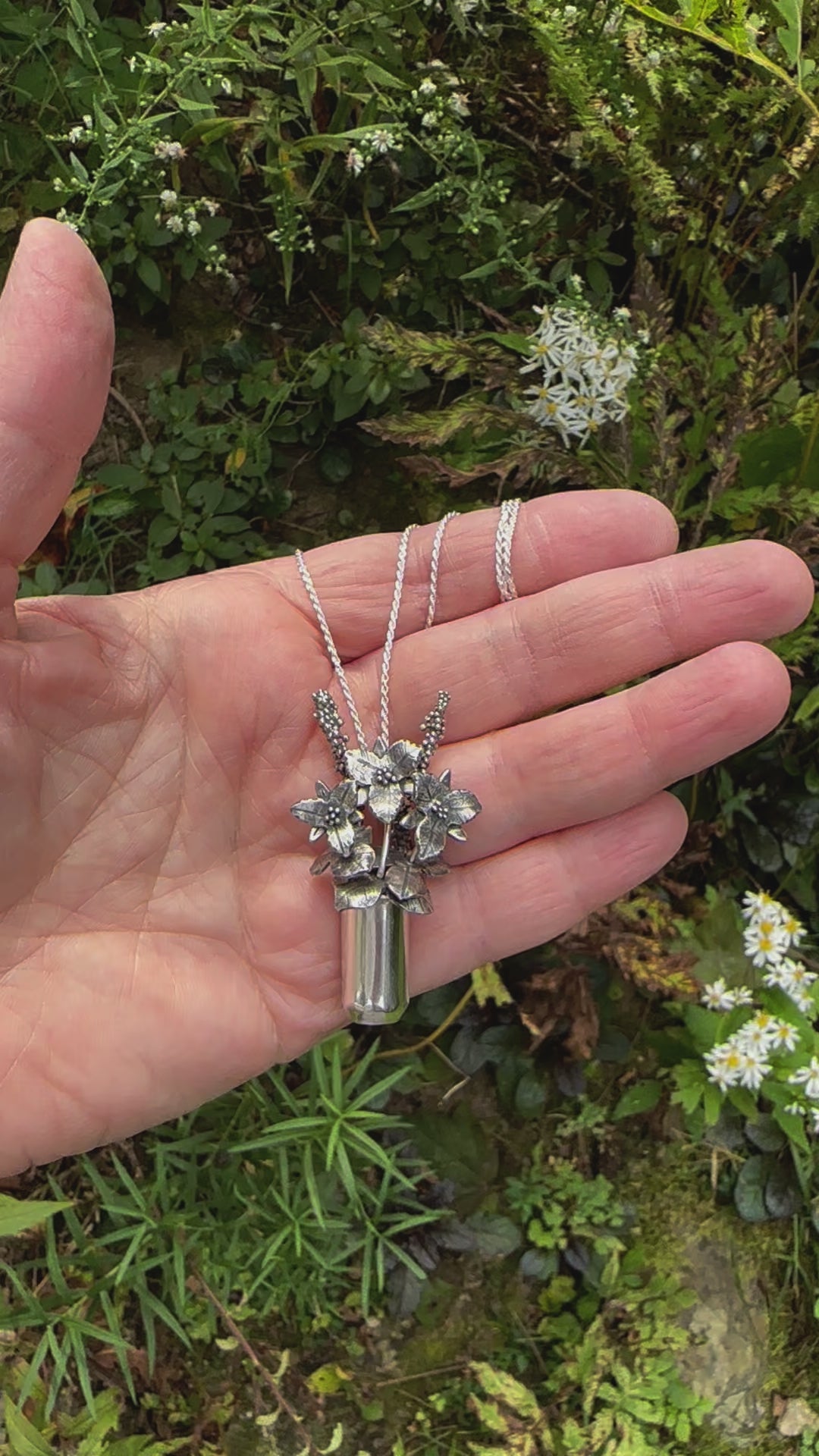 A tiny bouquet of our favorite spring ephemerals! This trillium bouquet features hand cut and shaped sterling silver flowers and leaves tucked inside their vase to last forever. The perfect necklace to wear to remind you to always be flaring and luminous as you walk through life.